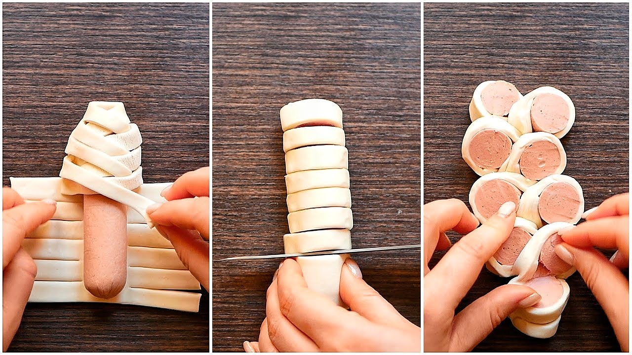 как завернуть сосиску в слоеное тесто на видео